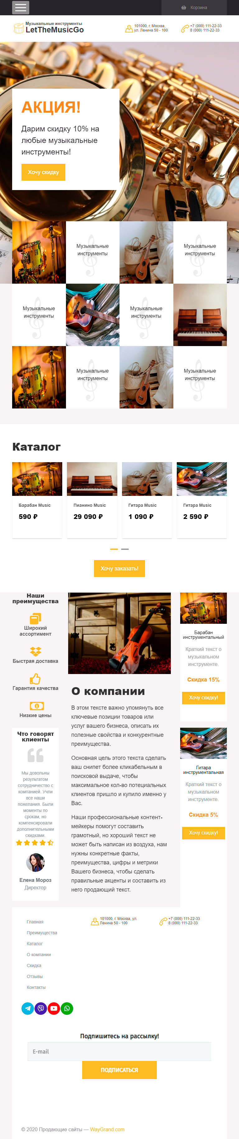 Закажите готовый продающий сайт лендинг #0710201 в Нижнем Новгороде за 1-3 дня «под ключ»: свёрстан, отрисован и готов к рекламе. Тематика шаблона «Музыкальные инструменты».